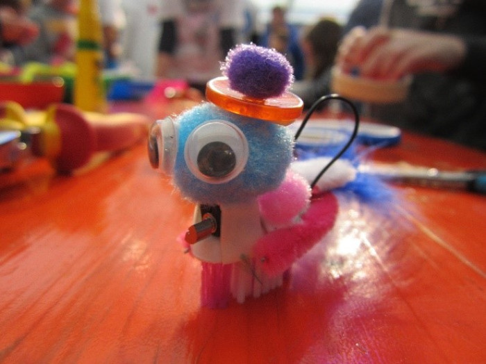 In diesem Workshop lernen die Kinder beim Bau ihres eigenen kleinen Bürstenflitzers, einem Mini-Roboter, spielerisch die Grundlagen von Stromkreisen und Motorsteuerung. Ein Bürstenflitzer ist ein Mini-Roboter, dessen Körper aus einer handelsüblichen Zahnbürste besteht. Das Herz des Roboters ist ein kleiner Vibrationsmotor (wie er auch in Handys zu finden ist), der mittels einer kleinen Knopfzelle mit Strom versorgt wird. Durch Vibration wird die Bürste in Bewegung gesetzt und flitzt lustig umher.
